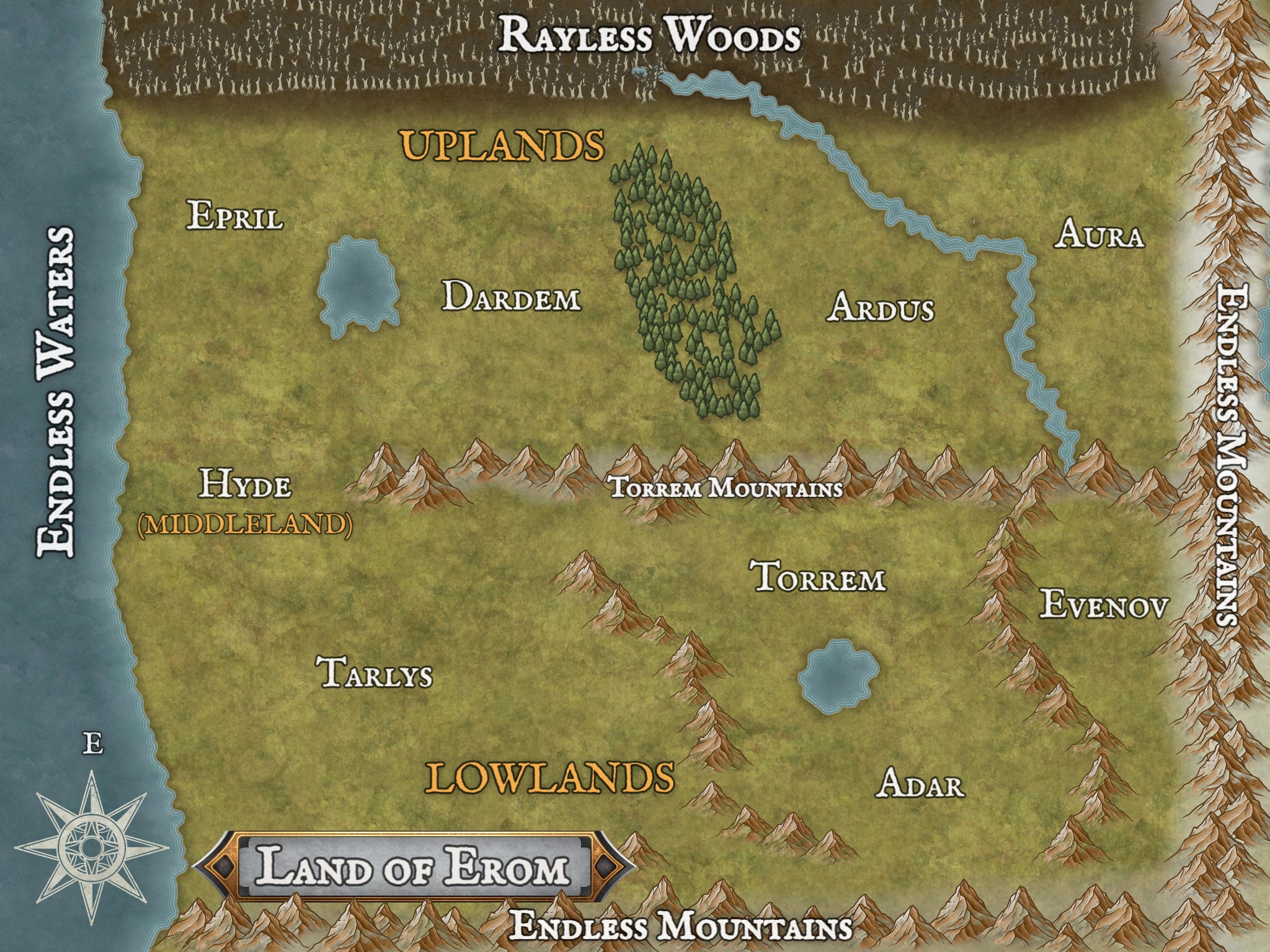 The Land of Erom is separated into two halves. The âUplandsâ are in the east, because thatâs where the sun rises. Ironically, that is also where the Rayless Wood is: a dark, mysterious and dangerous forest whose shadow slowly spreads throughout the land like a sickness. The forest between Dardem and Ardus as well as the mountains between Tarlys and Torrem separate the land into the Northern Territories (on the right) and the Southern Territories (on the left).